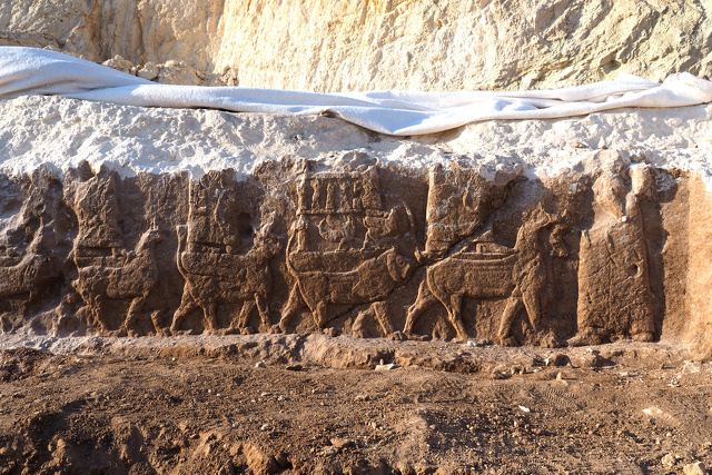 The carved panels, dating from about 2800 years ago, were found cut into bedrock above an ancient irrigation canal in the Faida district of Iraq's Kurdistan region. The unearthed panels show a procession of the seven main Assyrian gods and goddesses, standing or seated on mythical animals, and the Assyrian king Sargon II. So far, the archaeologists have unearthed 10 panels of intricate carvings in bedrock above what was once an ancient canal. Like the famous Assyrian carvings at Khinnis, these are sculpted as reliefs, with the prominent figures raised from a solid background.