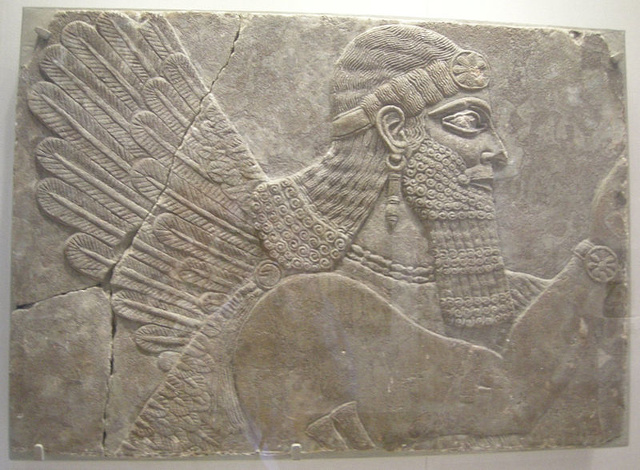 Apkallu from Nimrud Among the masterpieces of Assyrian art are 10-foot-high limestone panels with human-faced creatures with lion and bull bodies from the audience hall of the palace of Ashuraspal II at Nimrud; a 14.5-foot-high gypsum winged bull relief, with a human head, circa 710 B.C., taken from the Citadel gate at Duk Sharrukin near Nivenah; and an alabaster relief of a winged god taken from outside a palace door at the same site. A huge human-headed bull at the site was hacked into pieces by looters.