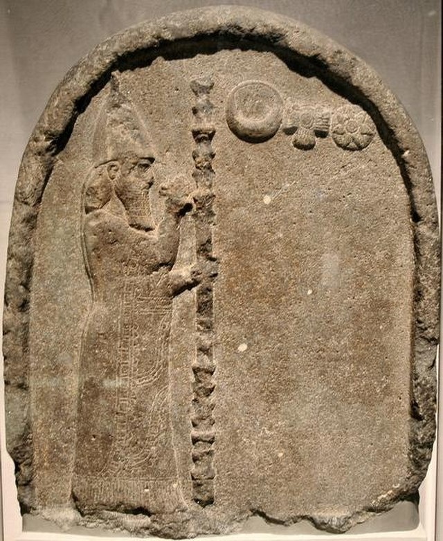 Images of Nabonidus show him wearing a conical cap. One famous depiction on a 56-centimeter (22-inch-high) basalt stela shows him gripping a staff and praying to celestial symbols representing three deities: Sin; the goddess Ishtar, represented by a star symbol; and Shamash, the sun god.