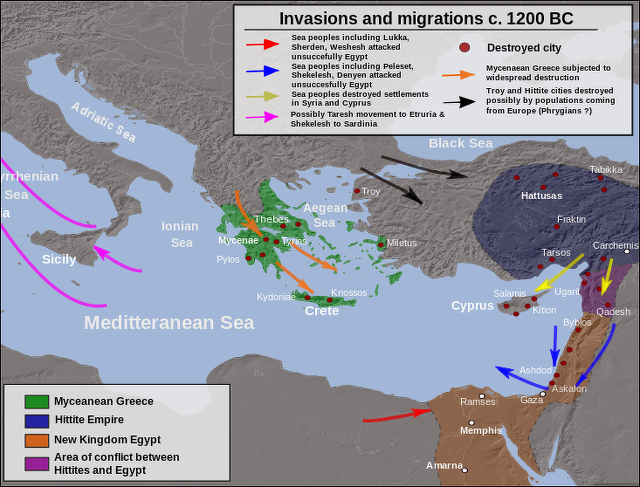 The Late Bronze Age collapse refers to widespread societal and state collapse during the 12th century B.C. associated with mass migration, and the destruction of cities and believed to have been caused of exacerbated by environmental change. The collapse affected a large area of the Eastern Mediterranean and the Near East, particularly Egypt, eastern Libya, the Balkans, the Aegean, Anatolia, and, to a lesser degree, the Caucasus. It was sudden, violent, and culturally disruptive for many Bronze Age civilizations, and it brought a sharp economic decline to regional powers, notably ushering in the Greek Dark Ages. [Source: Wikipedia]